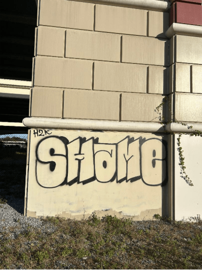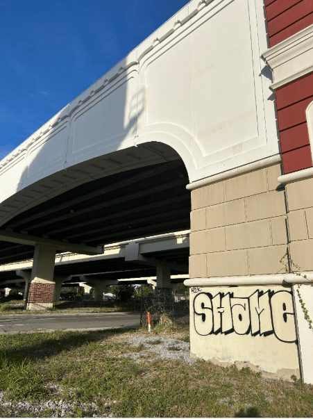 The 4×10 ft throw up was placed in front of the US 41 highway overpass, at the far end of 7th street, with black spray paint lettering and minimal shading allowing it to be easily read as people drive past. It was signed with intention. H2K sits atop his name, identifying his crew who he is in the graffiti world.