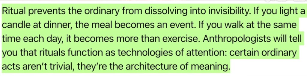As Han suggests, my hope is to move into an era of symbolic perception through rituals where I find comfort, flexibility, and a grounding home base throughout life’s changes. I will participate; I will hold space. And I will be consistent because these intentional moments matter.